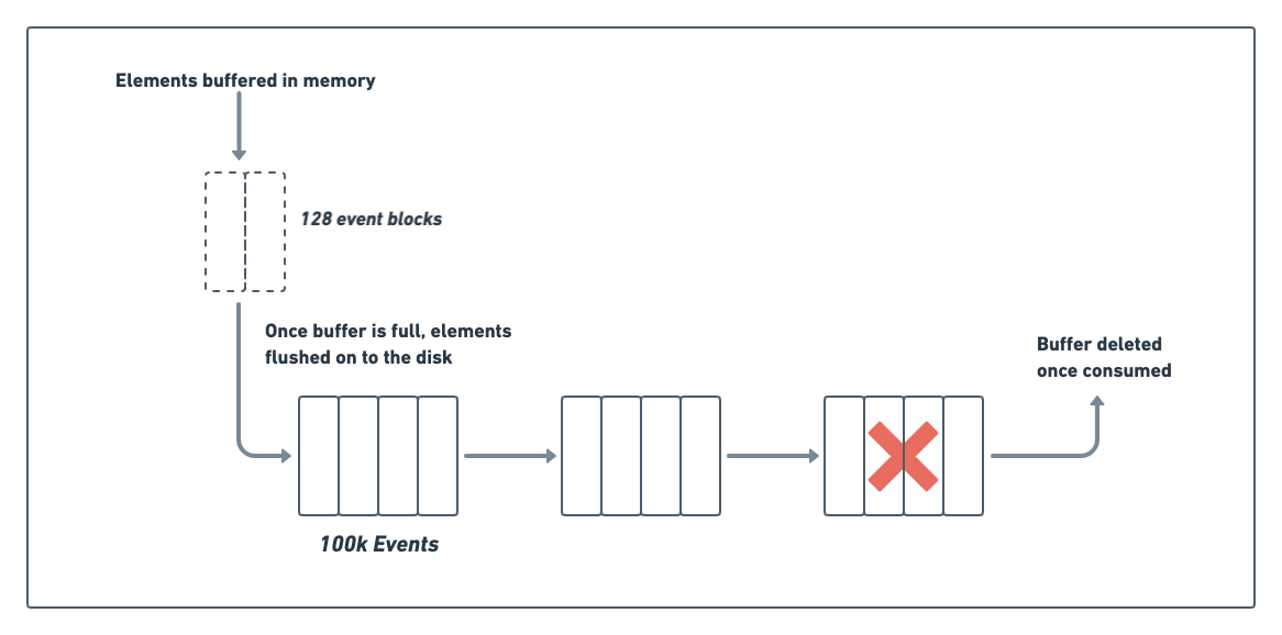 On the consumer side, we can process much bigger batches to avoid the overhead of doing small I/O. For this case, we create on-disk segments of 100K events, which the system processes together. Once the system processes a segment of batches, one can delete it (see the diagram below), in most cases: