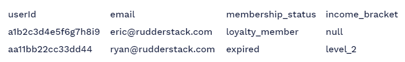 Once you have both data points in the warehouse, you can join them to create a table that includes a unique identifier for the user, their membership status, and their income bracket. The resulting table might look something like this: