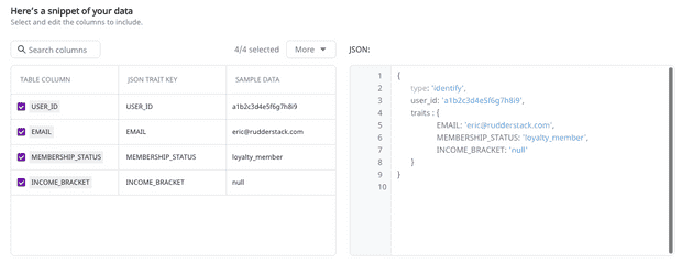 This part is easy: simply connect your warehouse to RudderStack, select the schema and table and verify that the table sample and resulting .identify() payload are correct. Here’s what this looks like in the RudderStack Reverse ETL interface:
