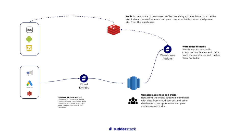 - Redis receives profile data from RudderStack Reverse ETL, a low-latency job that sends updates from a user profile table in the same format as event data. (This is important because using the same format requires far less engineering work.)