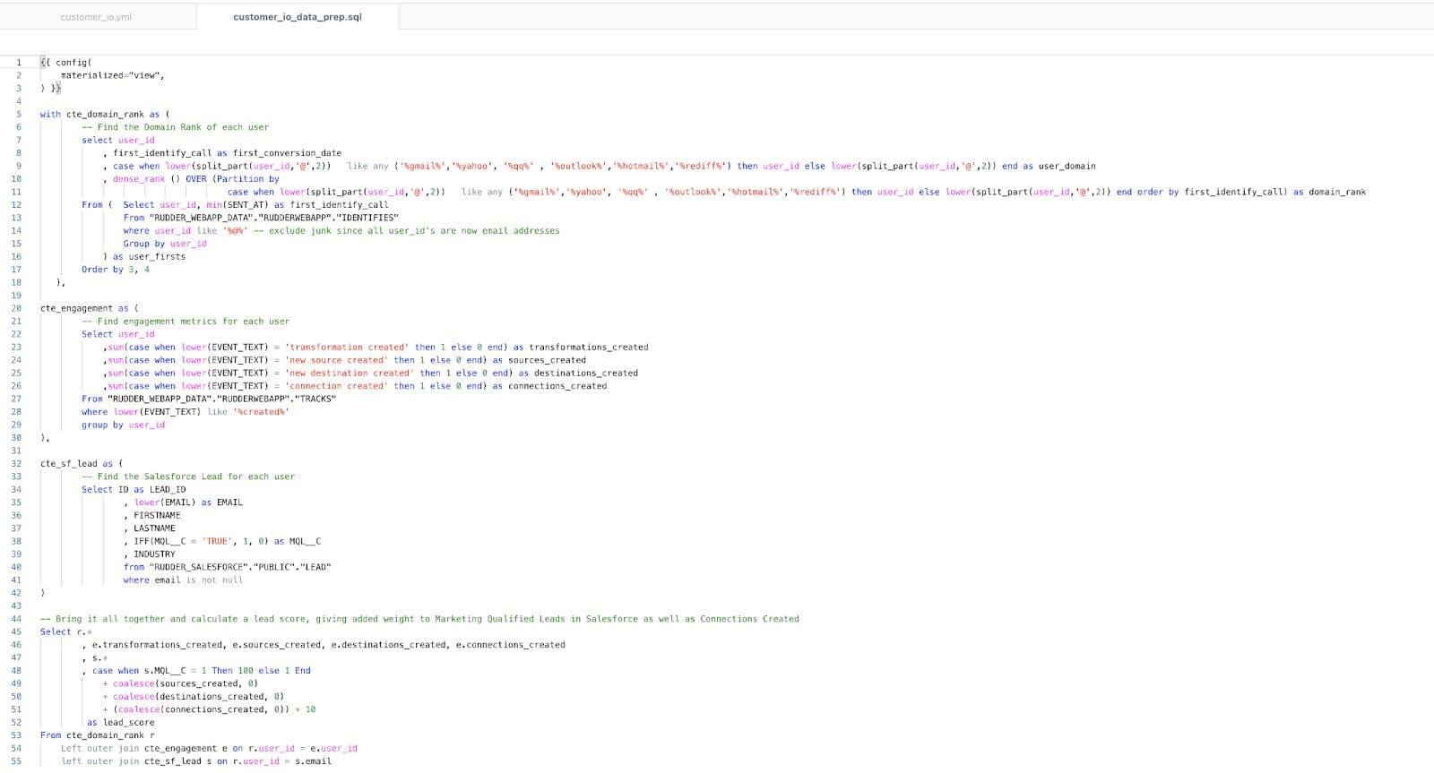 SQLwith cte_domain_rank as (-- Find the Domain Rank of each userselect user_id, first_identify_call as first_conversion_date, case when lower(split_part(user_id,'@',2)) like any ('%gmail%','%yahoo', '%qq%' , '%outlook%','%hotmail%','%rediff%') then user_id else lower(split_part(user_id,'@',2)) end as user_domain, dense_rank () OVER (Partition bycase when lower(split_part(user_id,'@',2)) like any ('%gmail%','%yahoo', '%qq%' , '%outlook%','%hotmail%','%rediff%') then user_id else lower(split_part(user_id,'@',2)) end order by first_identify_call) as domain_rankFrom ( Select user_id, min(SENT_AT) as first_identify_callFrom "RUDDER_WEBAPP_DATA"."RUDDERWEBAPP"."IDENTIFIES"where user_id like '%@%' -- exclude junk since all user_id's are now email addressesGroup by user_id) as user_firstsOrder by 3, 4),cte_engagement as (-- Find engagement metrics for each userSelect user_id,sum(case when lower(EVENT_TEXT) = 'transformation created' then 1 else 0 end) as transformations_created,sum(case when lower(EVENT_TEXT) = 'new source created' then 1 else 0 end) as sources_created,sum(case when lower(EVENT_TEXT) = 'new destination created' then 1 else 0 end) as destinations_created,sum(case when lower(EVENT_TEXT) = 'connection created' then 1 else 0 end) as connections_createdFrom "RUDDER_WEBAPP_DATA"."RUDDERWEBAPP"."TRACKS"where lower(EVENT_TEXT) like '%created%'group by user_id),cte_sf_lead as (-- Find the Salesforce Lead for each userSelect ID as LEAD_ID, lower(EMAIL) as EMAIL, FIRSTNAME, LASTNAME, IFF(MQL__C = 'TRUE', 1, 0) as MQL__C, INDUSTRYfrom "RUDDER_SALESFORCE"."PUBLIC"."LEAD"where email is not null)-- Bring it all together and calculate a lead score, giving added weight to Marketing Qualified Leads in Salesforce as well as Connections CreatedSelect r.*, e.transformations_created, e.sources_created, e.destinations_created, e.connections_created, s.*, case when s.MQL__C = 1 Then 100 else 1 End+ coalesce(sources_created, 0)+ coalesce(destinations_created, 0)+ (coalesce(connections_created, 0)) * 10as lead_scoreFrom cte_domain_rank rLeft outer join cte_engagement e on r.user_id = e.user_idleft outer join cte_sf_lead s on r.user_id = s.email