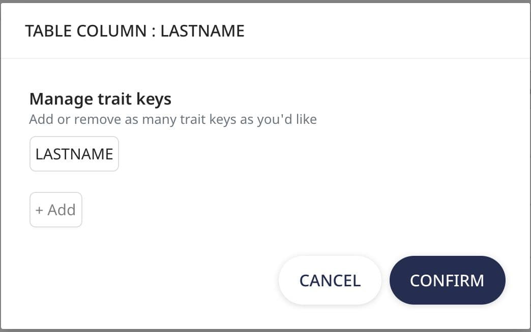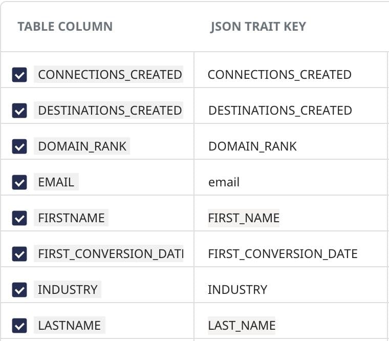 If we want to change the name of one of our traits, we can do so by clicking the value of the JSON TRAIT KEY and editing it. In our example, we will rename FIRSTNAME to FIRST_NAME and LASTNAME to LAST_NAME as that’s how they were previously defined in Customer.io.