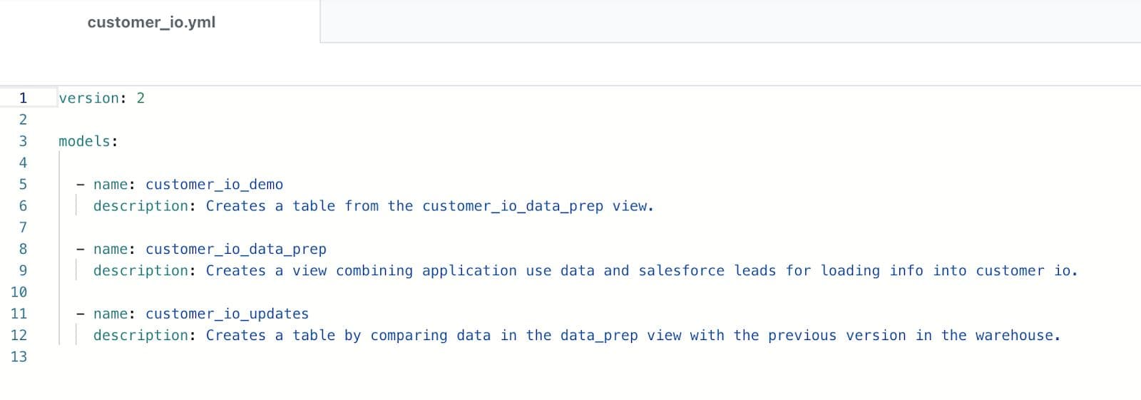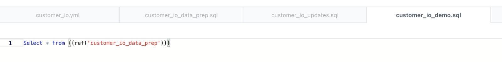 - Call the same SQL query used previously to create the customer_io_demo table. It is now materialized as a view using the customer_io_data_prep.sql model