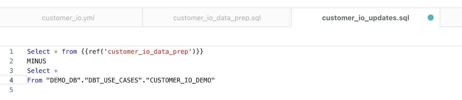 Create a new customer_io_updatets.sql model to compare the “current” values for each user to the previous value. We only want to include new and changed values in our Reverese ETL, so we use the MINUS function.