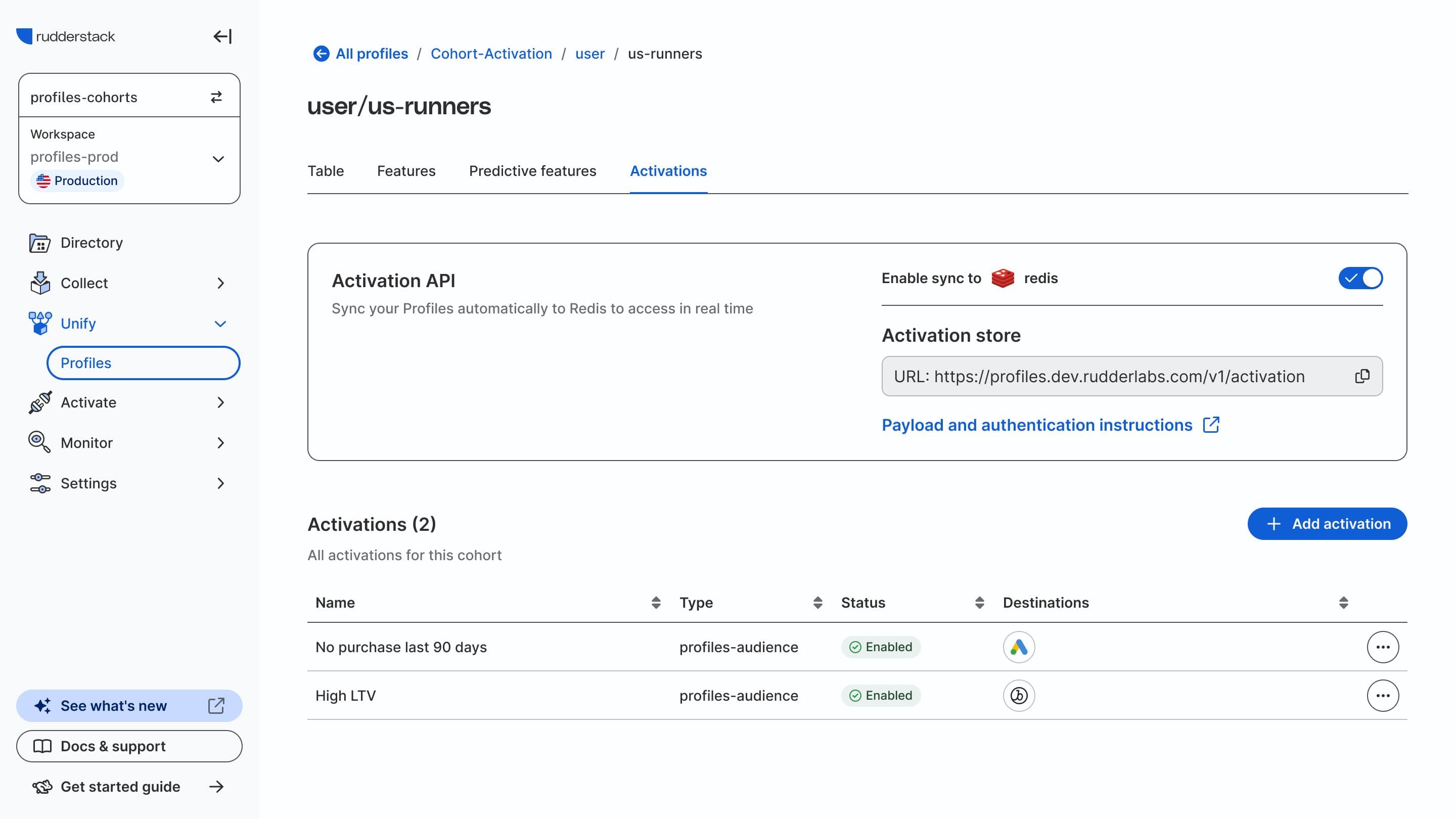 - Activations: Allows non-technical users to explore the customer 360, filter core cohorts into audiences, and sync them directly to their tools for tactical activation.