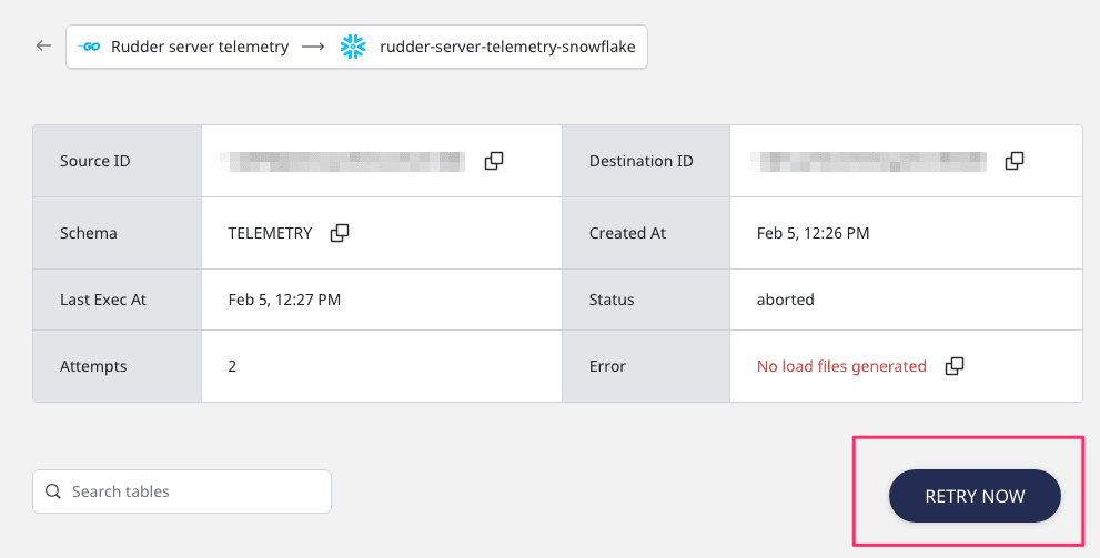 We previously announced the Syncs view in the UI, which gives you granular detail on all of your warehouse syncs. Now you can retry syncs that have failed or were aborted with a single click.