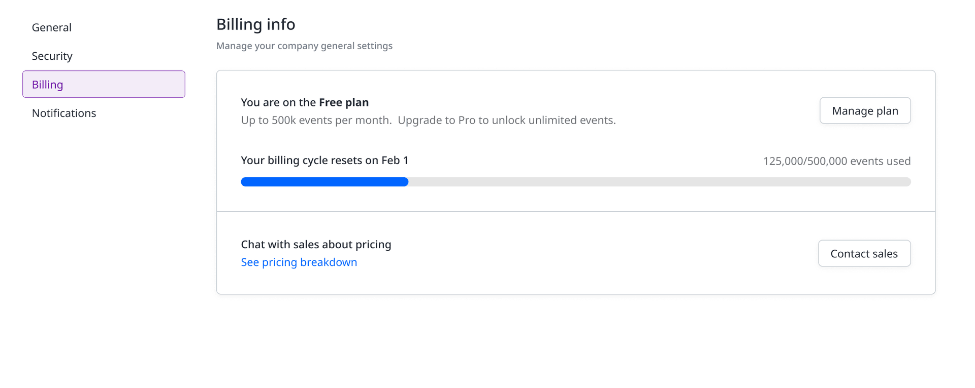 You can now track your monthly event volume in the billing section of the UI. This makes it easy to see how many events you’ve used and when your monthly billing cycle resets. Log in to see your current usage.
