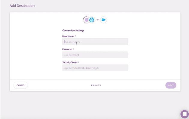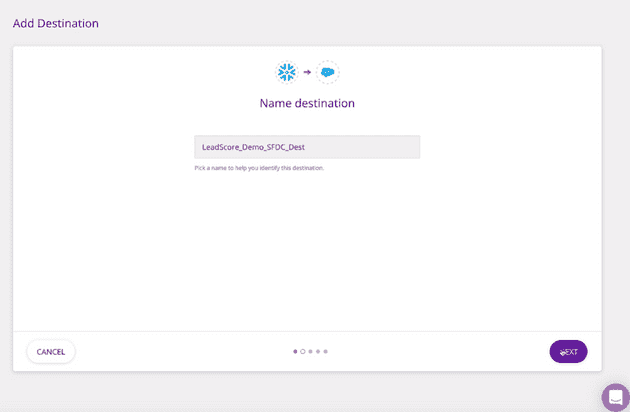 Next, name the destination, and connect it to the Snowflake source in the Connection Settings.