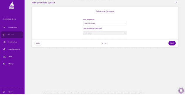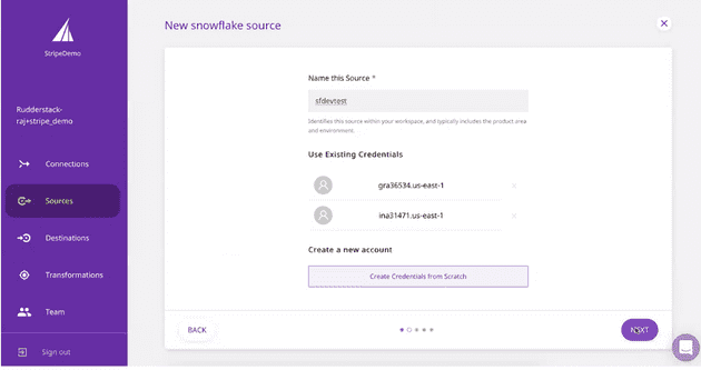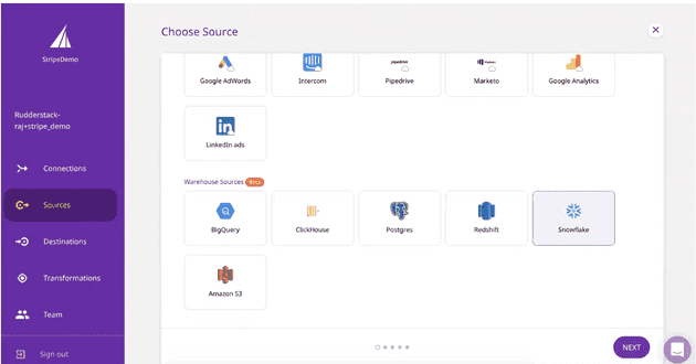 - Navigate to Sources in the left panel, select your preferred data warehouse to be added as Source, and click on Next.