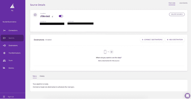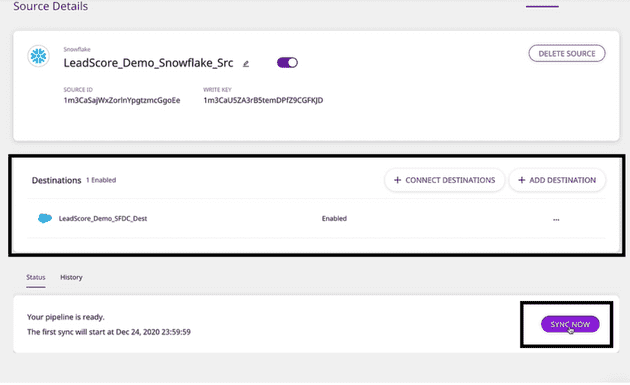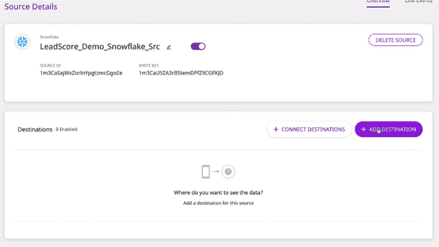 Now that your table from Snowflake is set up in Reverse ETL, you can push identify calls through RudderStack into Salesforce so your sales team can prioritize outreach. To do this, you need to add Salesforce as a destination by clicking on Connect Destinations or Add Destinations:
