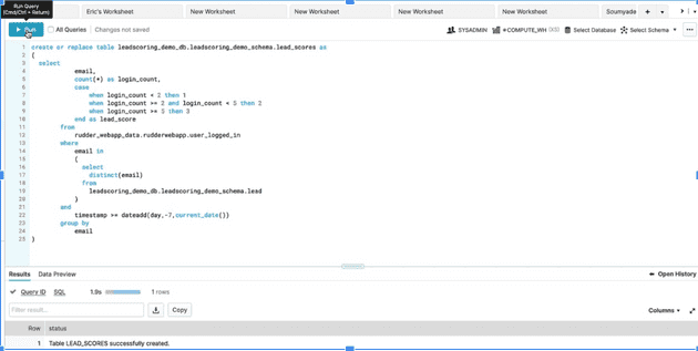 In Snowflake, the query to calculate lead score and produce a table might look something like this:
