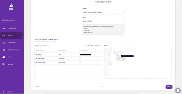 - Examine the table and define the data that should be pulled out of the data warehouse. In our example, we are pulling lead emails and lead scores. Note that you see the payload sent through RudderStack and can modify that payload by including/excluding keys and modifying column names to match fields in downstream destinations. Once you’ve configured the payload, click on Next.