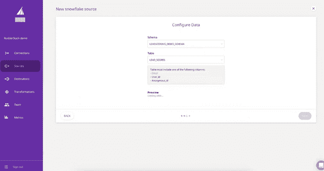 - Enter the data warehouse schema and the table name on the “Configure Data” page. RudderStack will collect the data from this table.