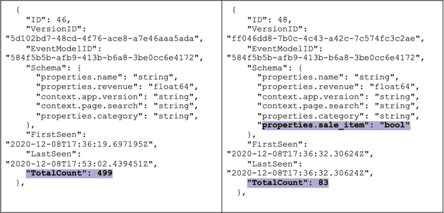 For example, let’s say someone instrumented a Product Purchased event that removed the properties.sale_item key. This means the most recent version of the event would not include that property.