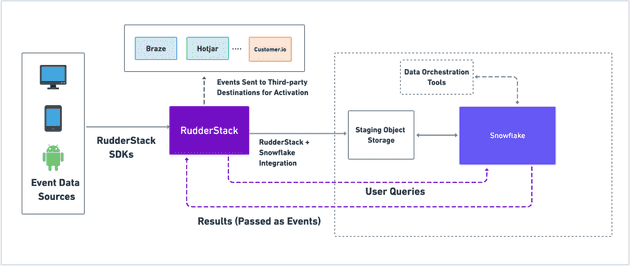 RudderStack also supports Snowflake as a data source. As seen in the diagram above, you can then run user queries on Snowflake via RudderStack and pass the results as events back to RudderStack. This enables sending Snowflake-enriched customer event data to your third-party marketing and analytics destinations for more advanced activation use-cases.