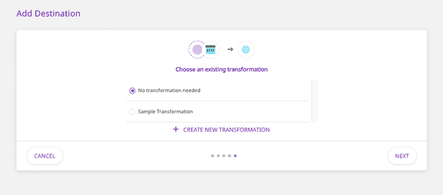 8. Finally, you can also choose to add a sample JavaScript transformation for your event data or create your own custom transformations. Choose the appropriate option as required, and click Next.