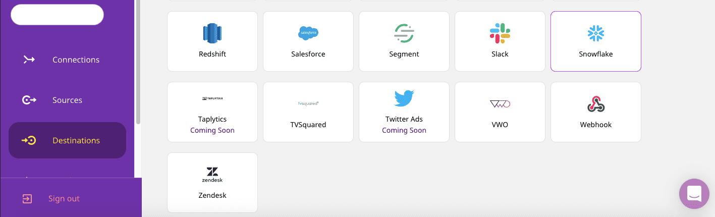 2. Navigate to Destinations in the left panel, select Snowflake, and click on Configure.