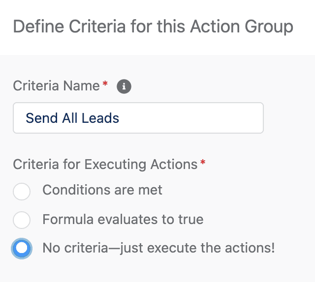 In the next step we define the criteria for which this action should fire. In our example we want all leads to fire once they’ve been created so we will not apply any filters and check the “No criteria - just execute the actions!” option.