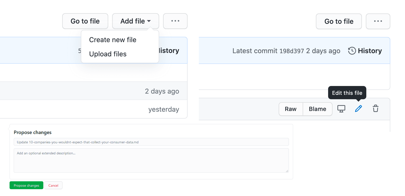 - Also, to suggest changes to an existing file, go to the file and select Edit this file.