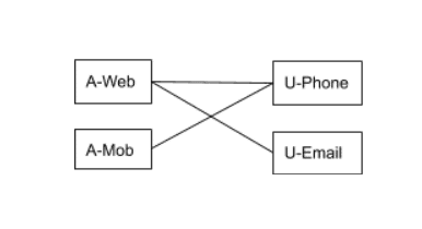 One should be able to associate all the web events (collected in steps 1 and 3) and the mobile events (collected in step 2) as originating from the single end-user. One way to achieve that is to create a mapping between all these individual IDs (A-Web, A-Mob, U-Phone, and U-Email) into a single virtual user ID. You can associate all the events with this virtual user ID. You can do this by doing a JOIN between the event table (which has the individual IDs) and the ID to the virtual ID mapping table.