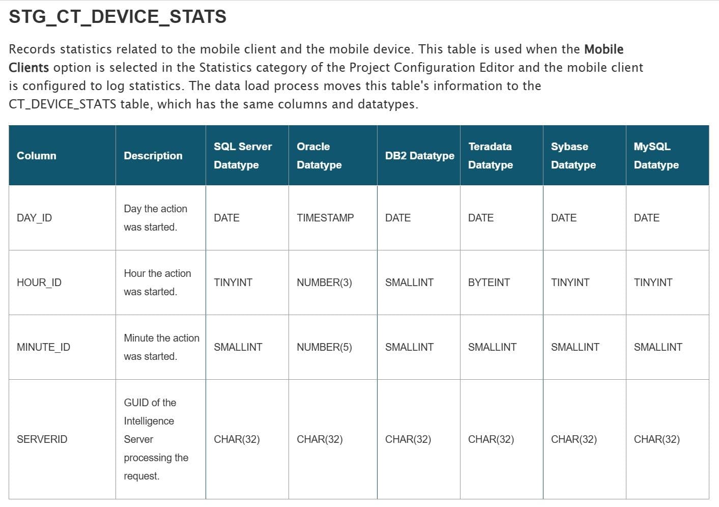 A well-made data dictionary needs to be comprehensive while remaining user-friendly and accessible. One example is the extensive data dictionary that MicroStrategy has created for its intelligence server statistics. The dictionary includes detailed information for each staging table in the statistics repository. Below is an example, the STG_CT_DEVICE_STATS, which is for the recording of statistics related mobile clients and devices.