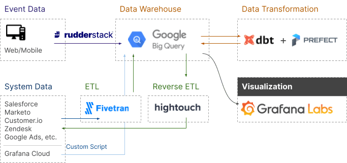 To make this even more real, let’s look at an example architecture from an actual company. Grafana is an open-source analytics and visualization tool that offers querying, alerting, and more to help companies understand their data. They wrote about the stack they use to drive business intelligence and included an excellent architectural diagram of the Growth Stack.