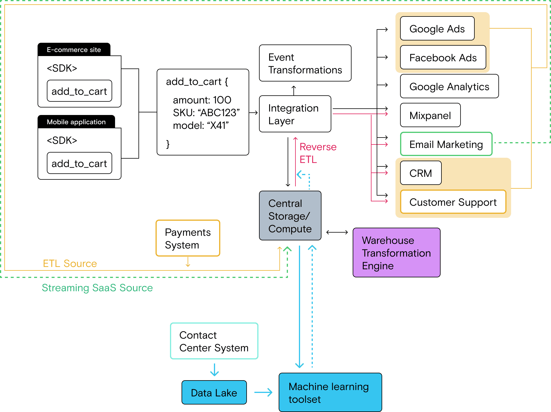 Before we get to the hot topic of machine learning, let’s do a quick recap of where we are in the data maturity journey. In the Starter Stack, you solved the point-to-point integration problem by implementing a unified, event-based integration layer. In the Growth Stack, your data needs became a little more sophisticated—to enable downstream teams (and management) to answer harder questions and act on all of your customer data, you needed to centralize both clickstream data and relational data to build a full picture of the customer and their journey. To solve these challenges you implemented a cloud data warehouse as the single source of truth for all customer data, then used reverse ETL pipelines to activate that data.