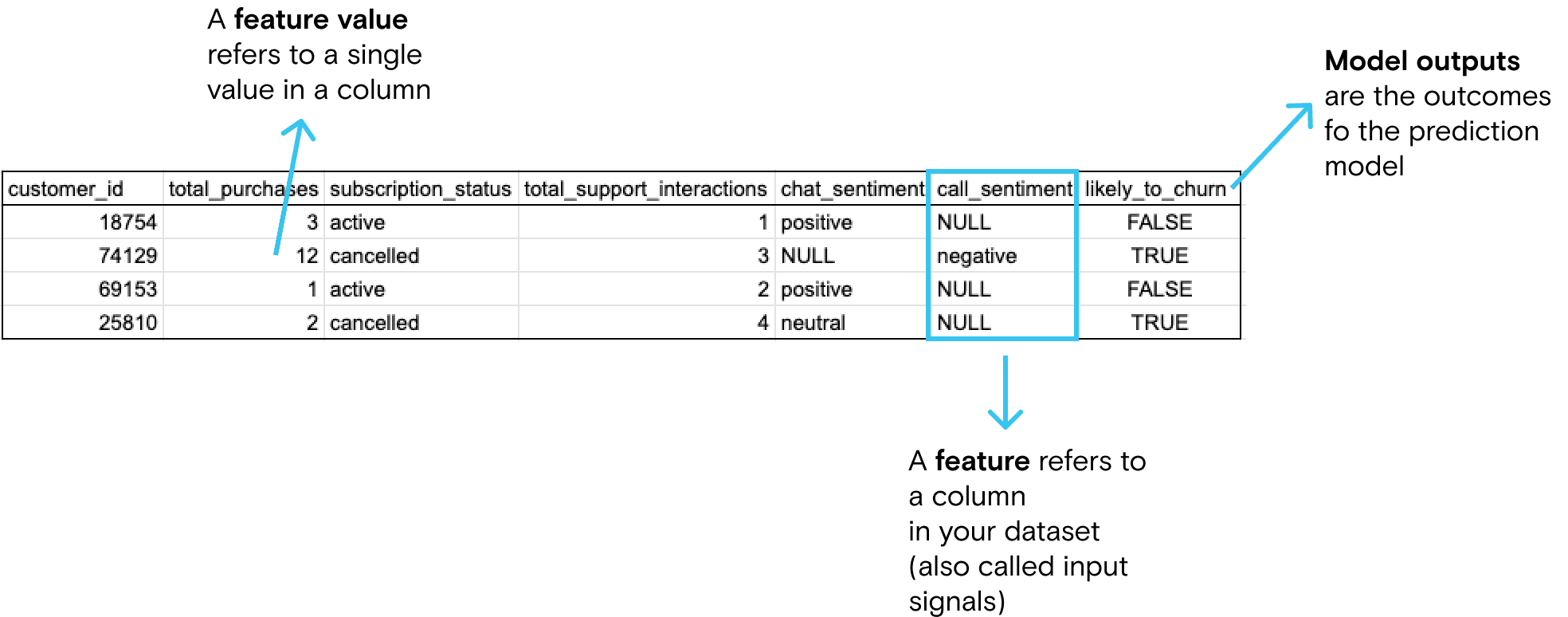 Outputs are exactly what you would expect: the results of the model. These are called features in the ML and data science world, and we’ve already discussed one great example: a churn score.