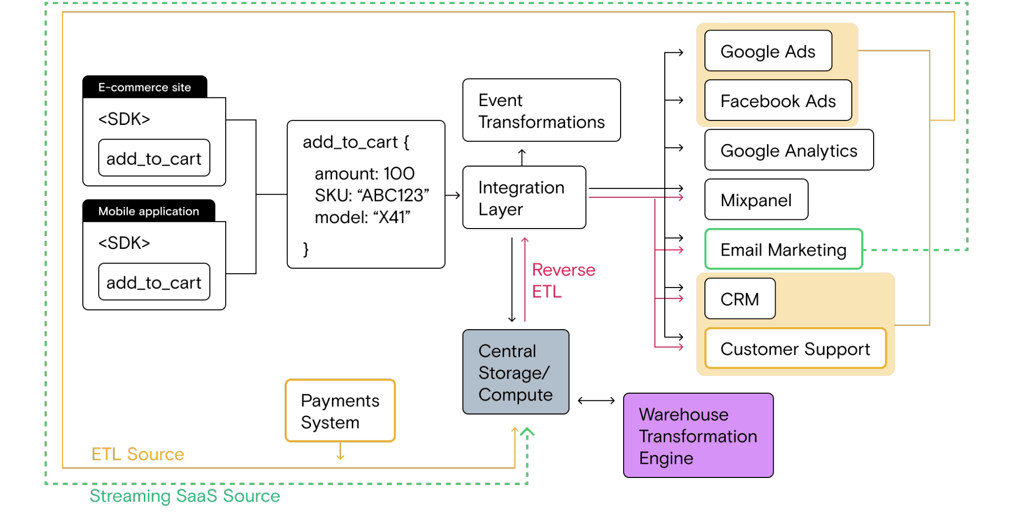 At this point, life is good. All of your customer data is collected and sent to your entire stack in real-time to cloud tools via event streaming and in batch loads to your data warehouse (via both event streaming batch loads as well as ETL for relational data). This means you can build a full view of your customer and push complete profiles, computed traits, and even audiences from your warehouse back to your stack via reverse ETL.