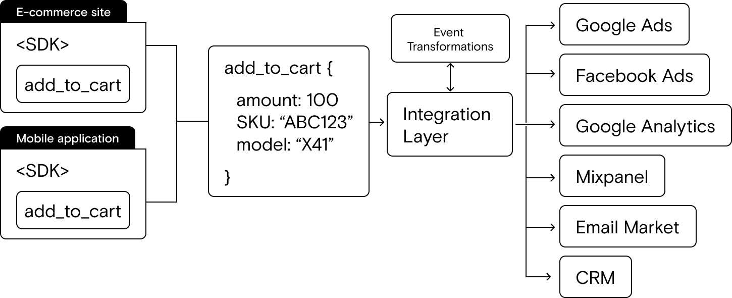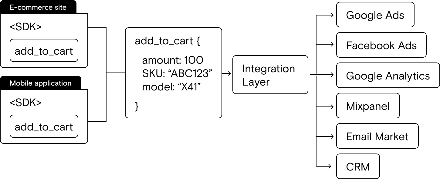 That’s where the integration layer comes in. Instead of running multiple SDKs and sending events in various formats, you translate the standardized payloads for each destination, meaning each different API is getting the same set of data.