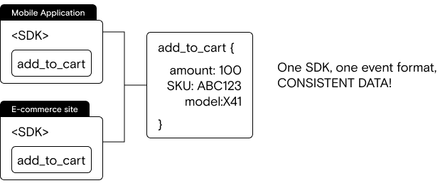 Instead of instrumenting multiple SDK and multiple versions of the same event, we instrument one SDK and one, consistent version of the event in every platform: