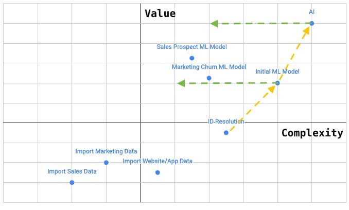 This will help you quickly identify your highest-impact projects. However, it could cause you to ignore some projects with low initial value that are required to unlock higher-value projects. To account for this, draw lines (yellow in the example above) connecting these lower-value projects to the higher-value initiatives they support. You can also draw lines (green in the example above) representing the reduction in complexity for the higher-value initiatives upon completion of prerequisite projects. It’s a simple framework, but it gives you a clear roadmap to accomplish those high-value, high-complexity projects.