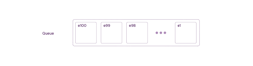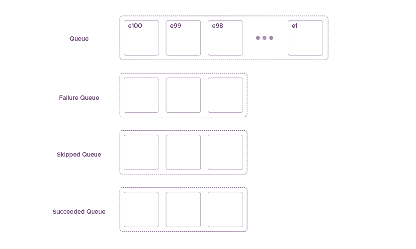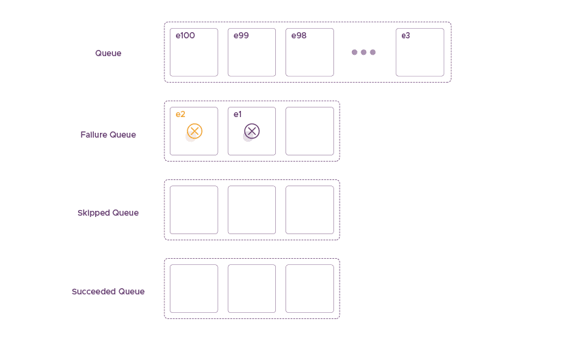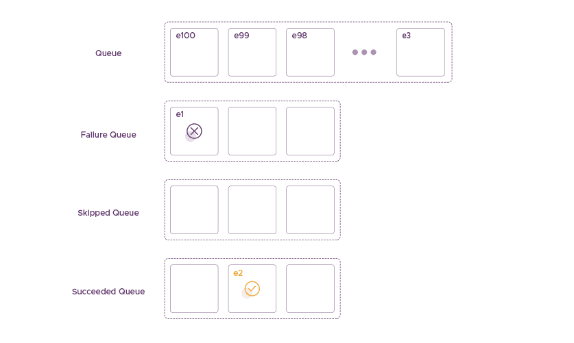 After RudderStack moves event e1 into the Failure Queue, we move into the next event, e2. The reason for using a queue for each state will become clear using the following scenarios.