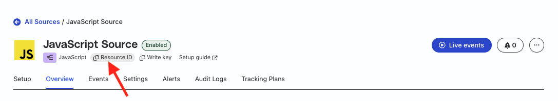 • Set up a JavaScript source in your RudderStack workspace and note its Source ID: