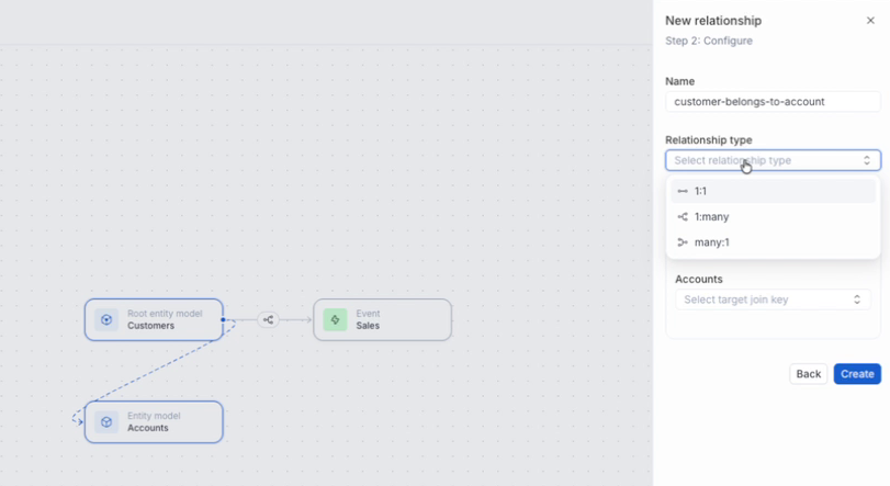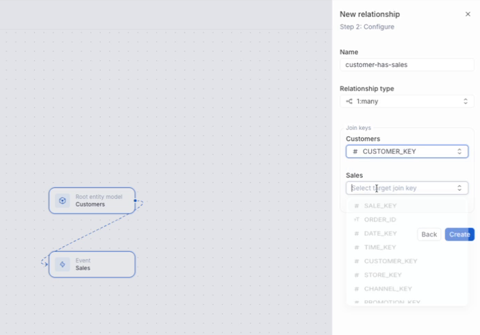 The drag and drop method is an alternate way of creating relationships between models. In this method, you visually connect one model with another on the canvas — a configuration pane opens where you can define the relationship details.