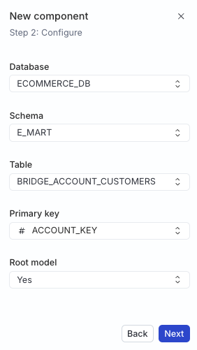 If you configured a root model in the previous step, the Database and Schema fields will be pre-populated with the relevant values.