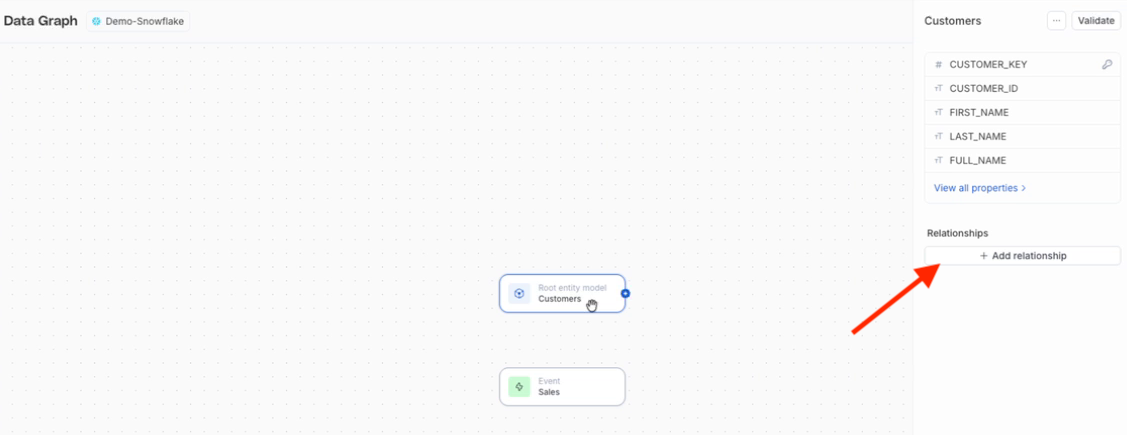 At this point, the data graph base definition (warehouse connection context) is established. You can now start defining the entities and events for the data graph.