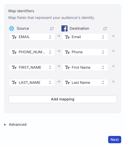 In this section, you can map your warehouse columns to specific Custom Audience fields that represent your audience’s identity.
