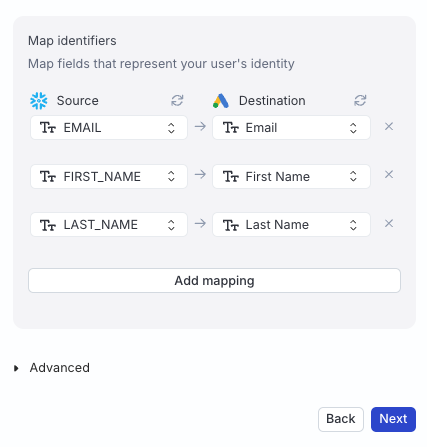 In this section, you can map your warehouse columns to specific Google Ads fields that represent your audience’s identity.