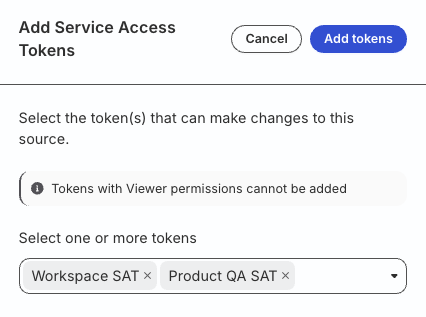 To allow edit access to specific SATs within your workspace, click Only people and Service Access Tokens you select and click the Service Access Tokens tab. Then, click Add tokens.