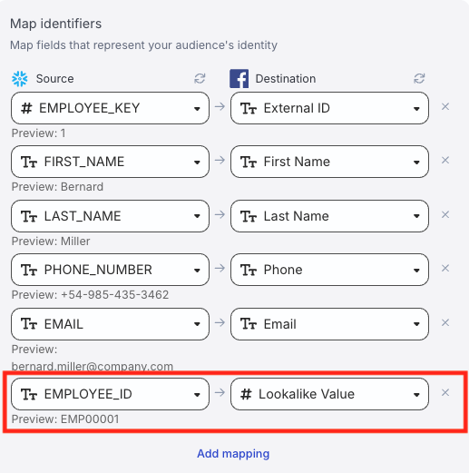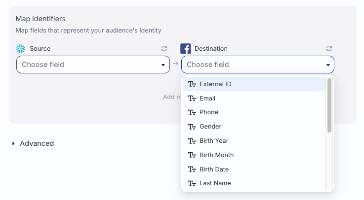 In this section, you can map your warehouse columns to specific Custom Audience fields that represent your audience’s identity.