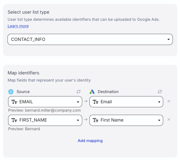 In this section, you can map your warehouse columns to specific Google Ads fields that represent your audience’s identity.