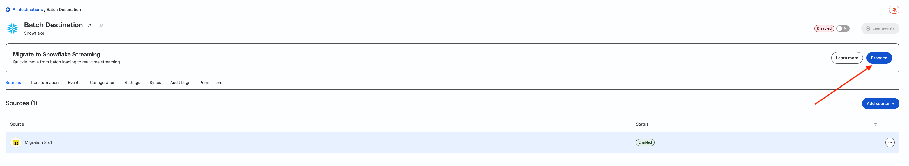 Migrate all sources connected to the Snowflake batch destination to the new Snowflake Streaming destination.