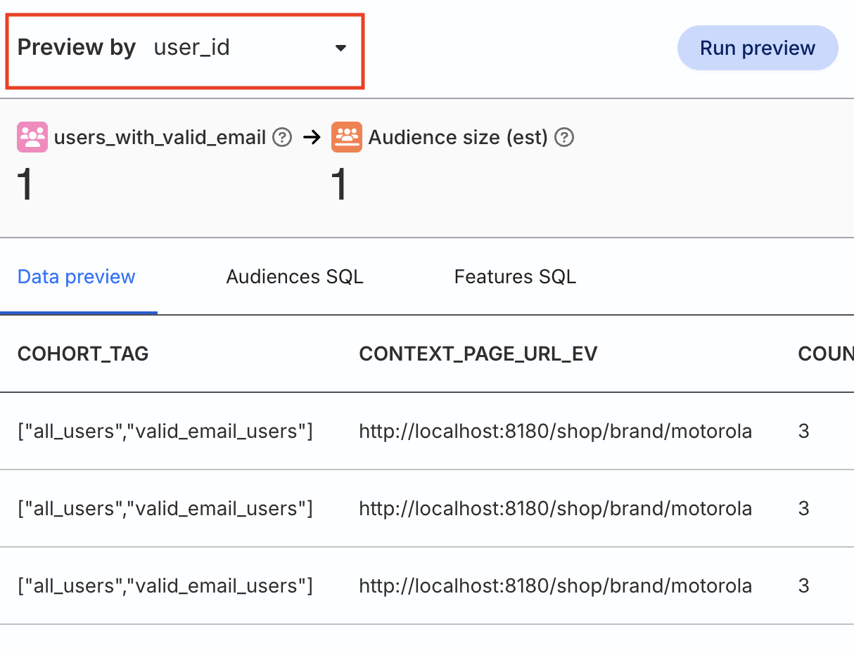 You can preview the data by selecting a specific identifier (user_id, email, rudder_id, etc.) — the audience is created using that ID as the primary identifier.