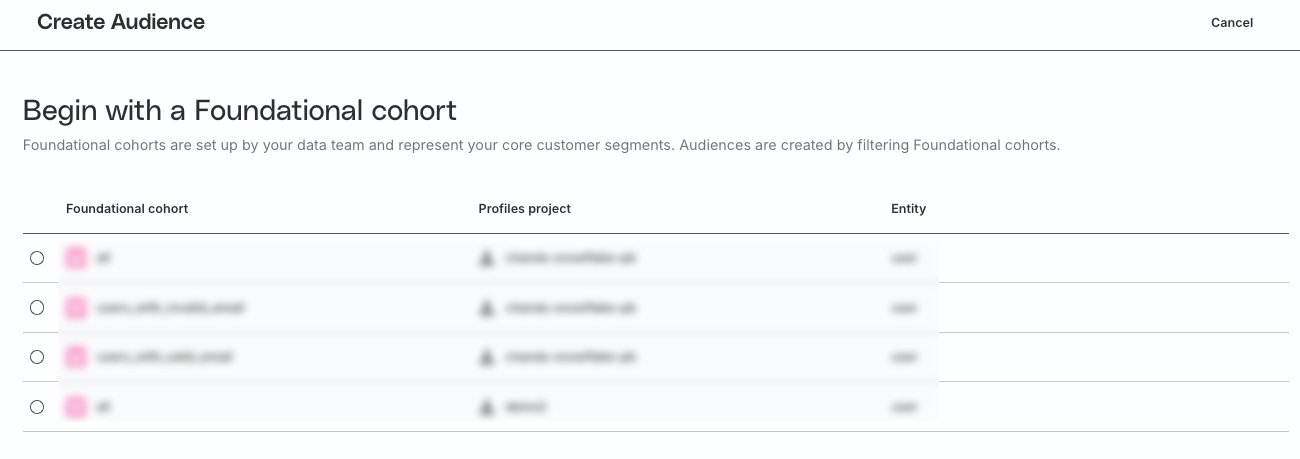 Foundational cohorts represent your core customer segments — they are set up within your Profiles project by the data team. You can create new audiences by filtering these cohorts.
