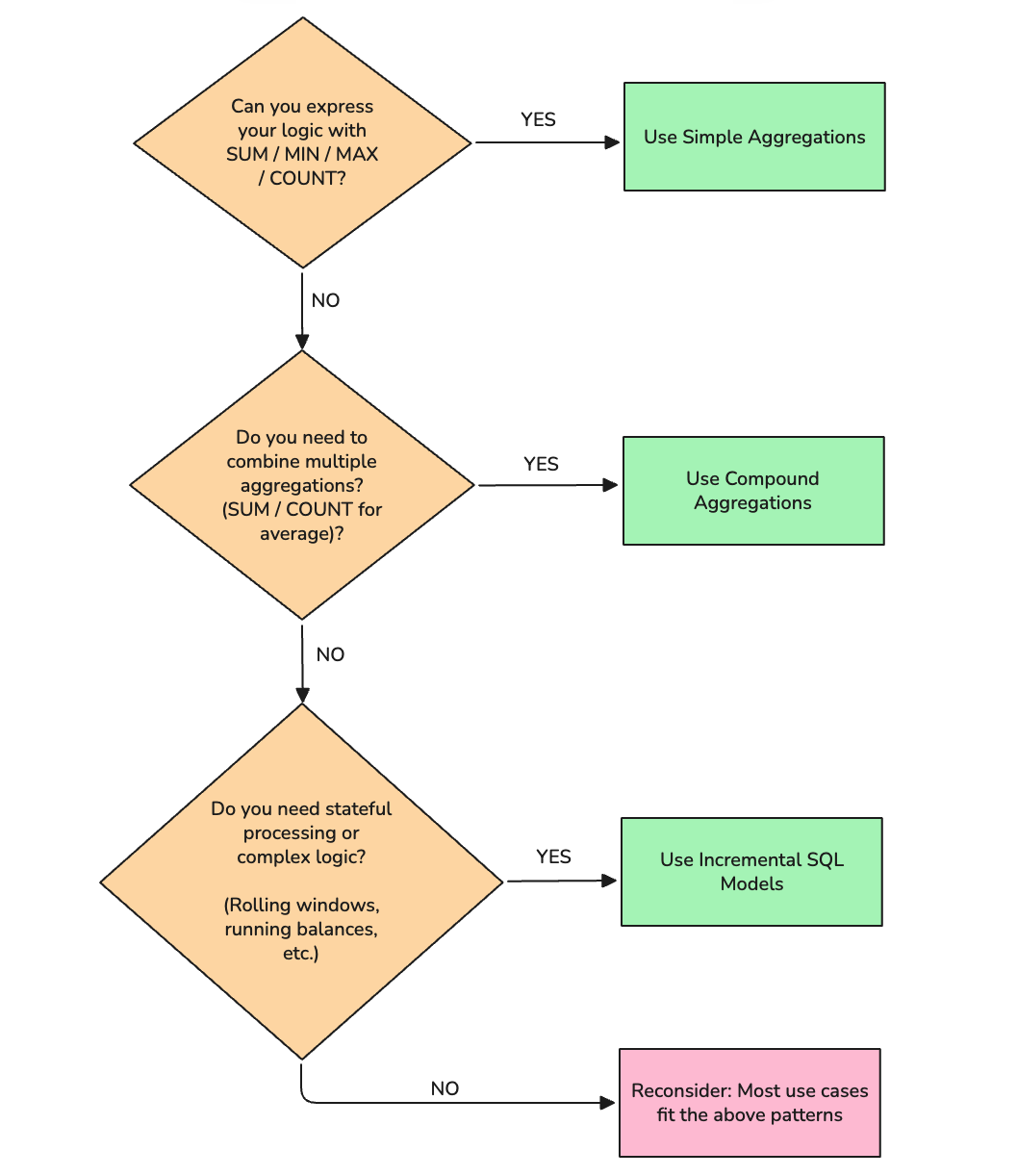 Start with simple aggregations first. If your use case doesn’t fit, move to compound aggregations. Use incremental SQL models only when simple and compound aggregations cannot express your requirements.