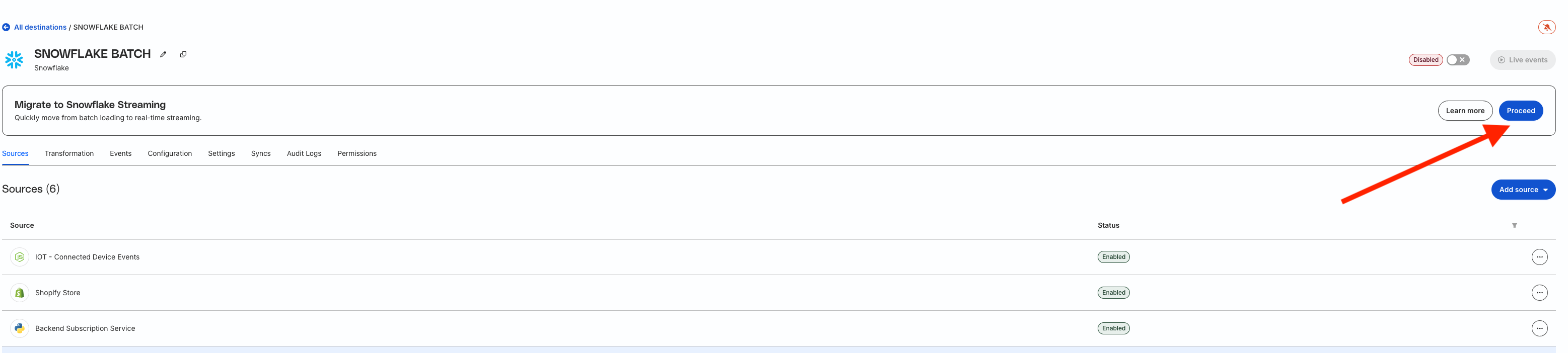 Go to your existing Snowflake batch destination in the RudderStack dashboard.