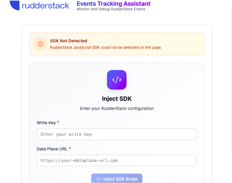 If no SDK is detected, you can manually inject the SDK for testing. Enter your write key and data plane URL, then click Inject SDK.