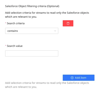 Salesforce Object filtering criteria: This optional setting lets you add the filtering criteria to read and ingest only the Salesforce objects relevant to you.