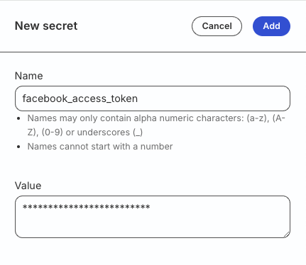 To edit a secret, click the edit icon, enter the new secret value, and click Save. Note that the previous secret value will not be visible.